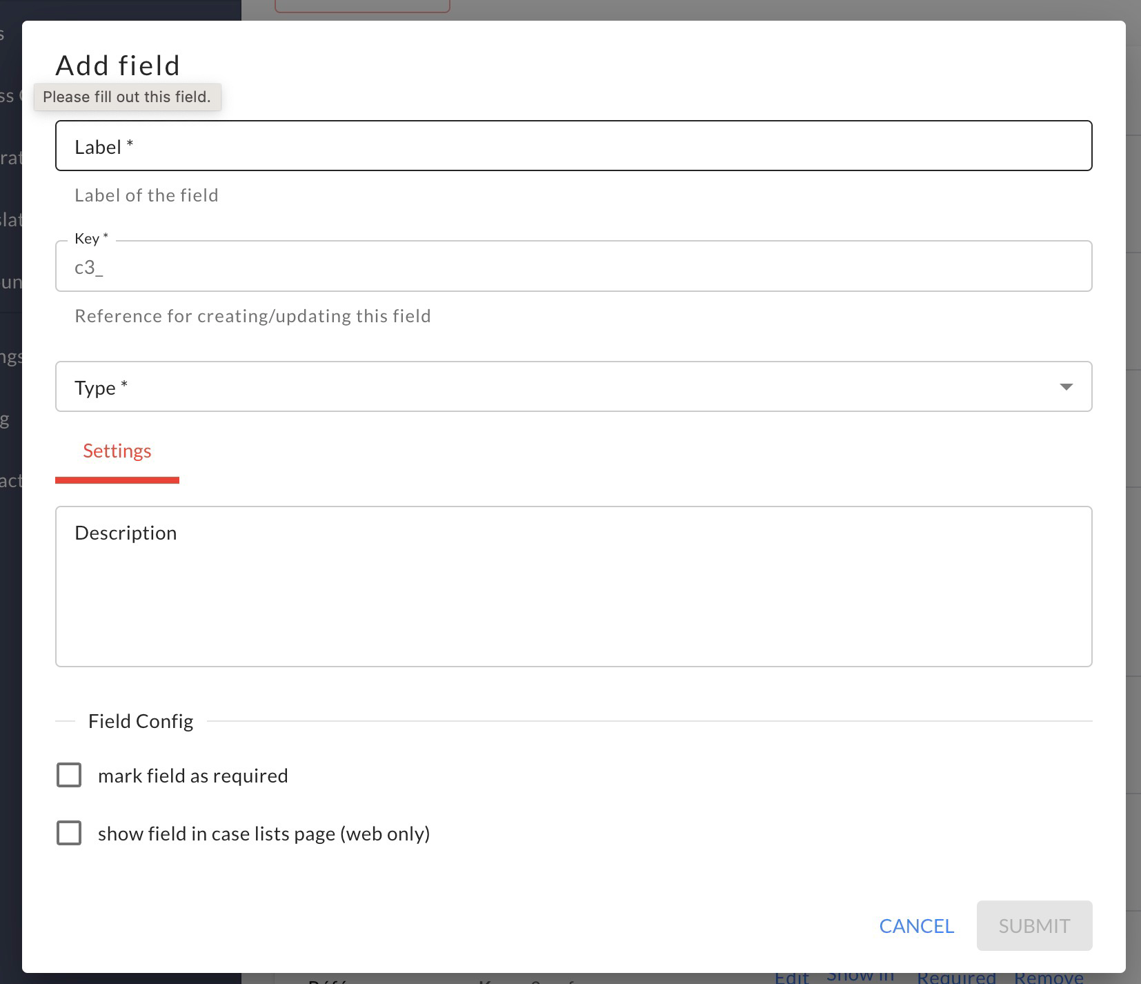 5. En el formulario de creación de campo, proporciona los siguientes detalles: