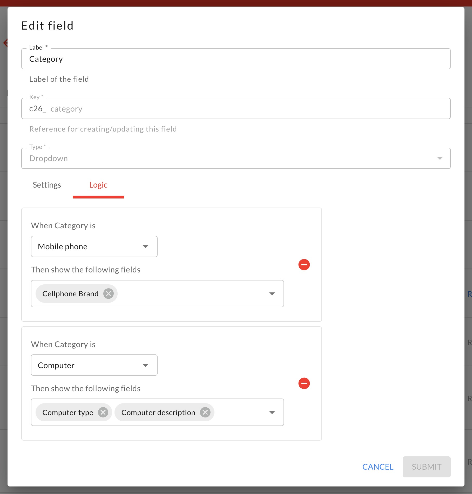 Haz clic en "edit" (editar) en el campo. 3. En el modal de configuración del campo, selecciona la pestaña Logic (Lógica) y luego selecciona add logic (añadir lógica).