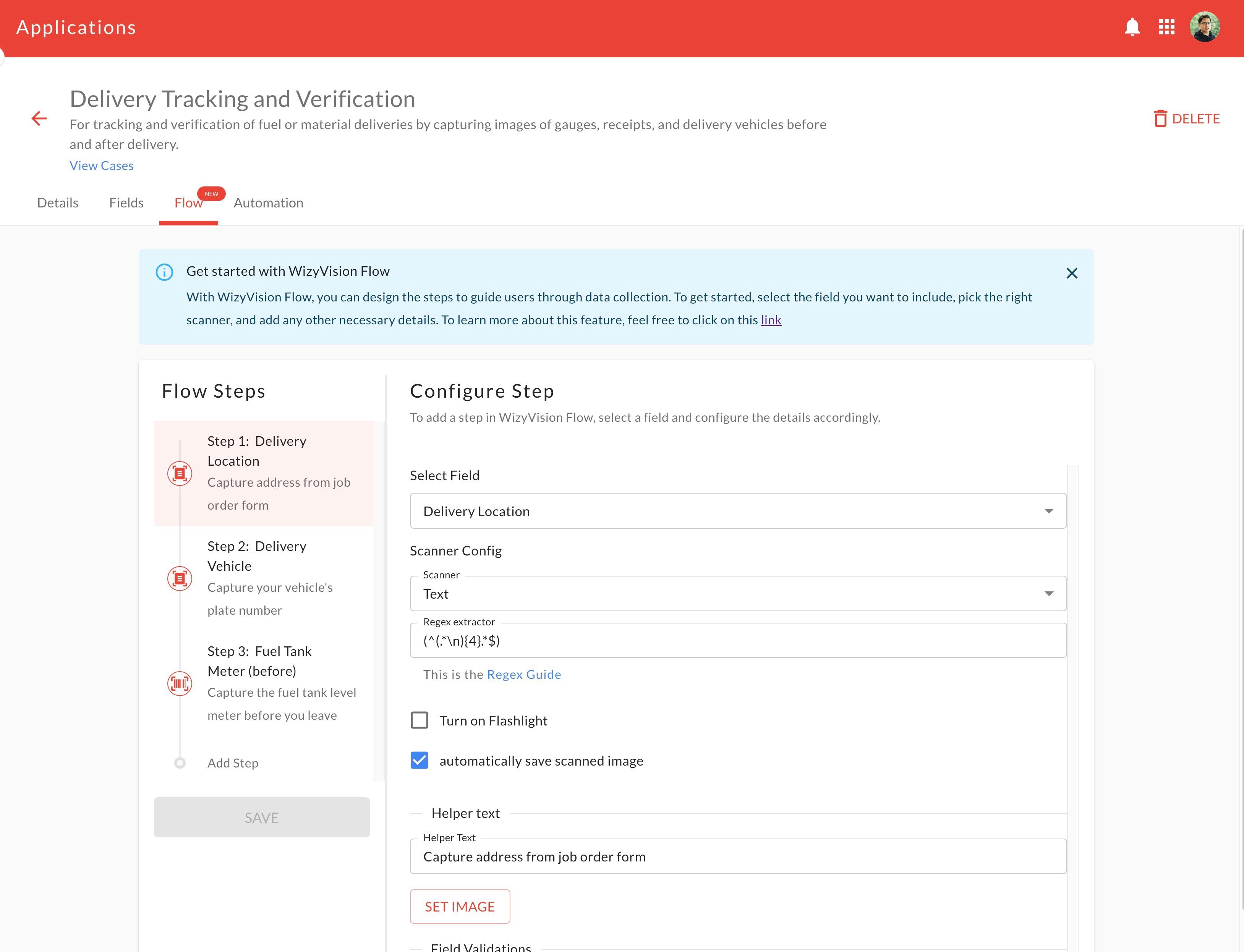 Add Fields to the Flow (Añadir Campos al Flujo): Con el diseño centrado en el usuario, puedes arrastrar y soltar campos fácilmente en el flujo. Define su orden, personaliza la configuración de los escáneres, los textos de ayuda (helper texts), las imágenes y más, sin tener que profundizar en la configuración de los campos individuales.