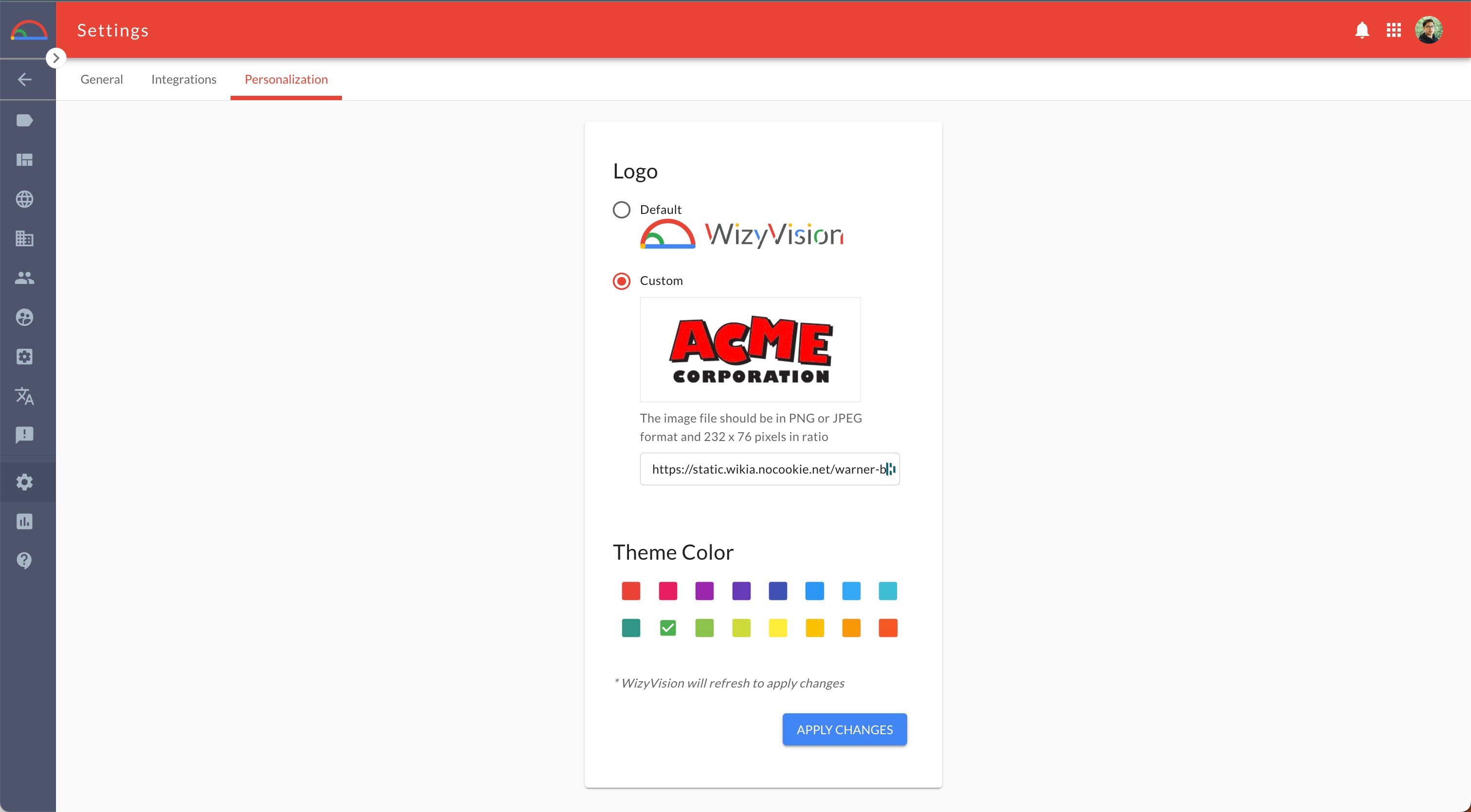 Pour mettre à jour le logo, accédez à l’onglet Personnalisation de la page Paramètres dans la section Admin. Téléchargez votre image de logo en utilisant l’option prévue à cet effet, et elle sera automatiquement appliquée à votre compte WizyVision.