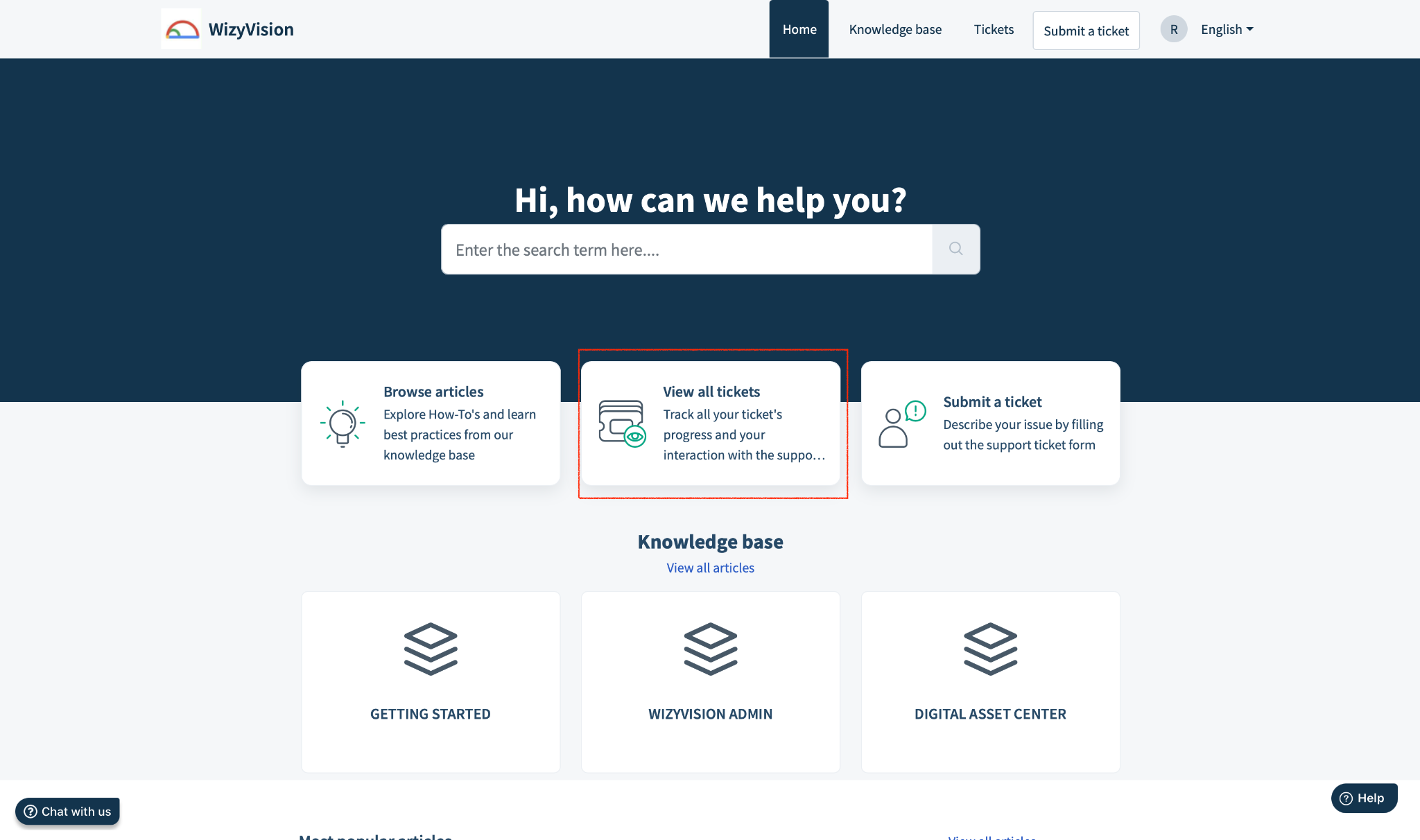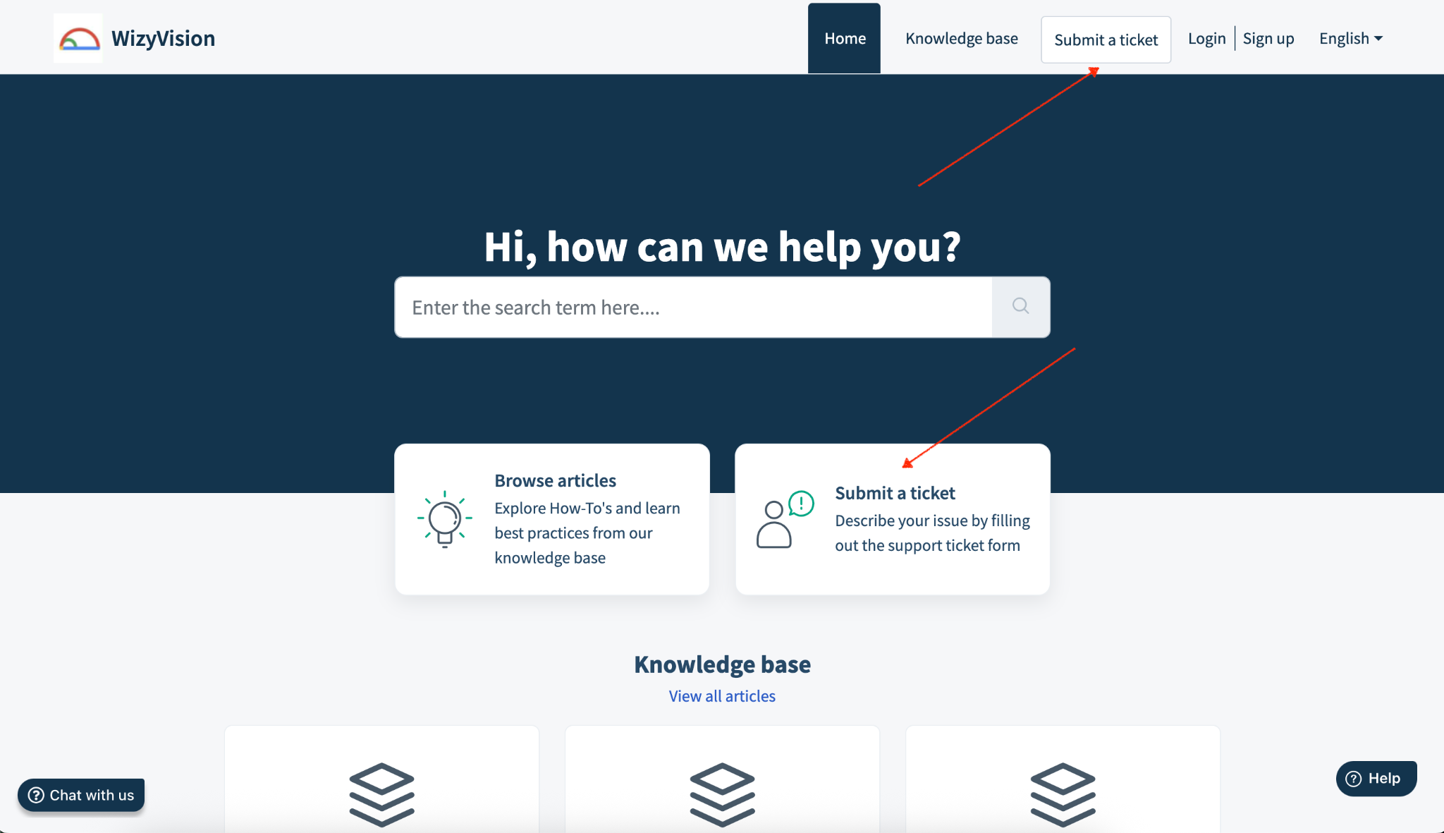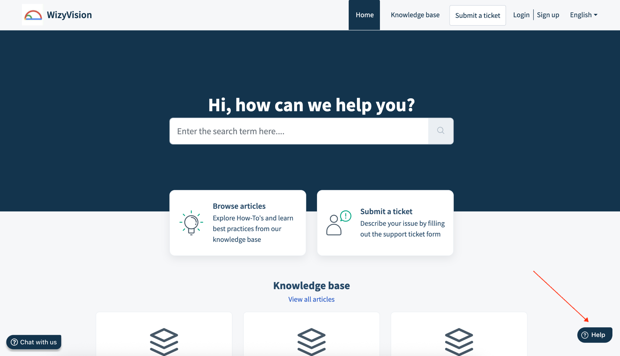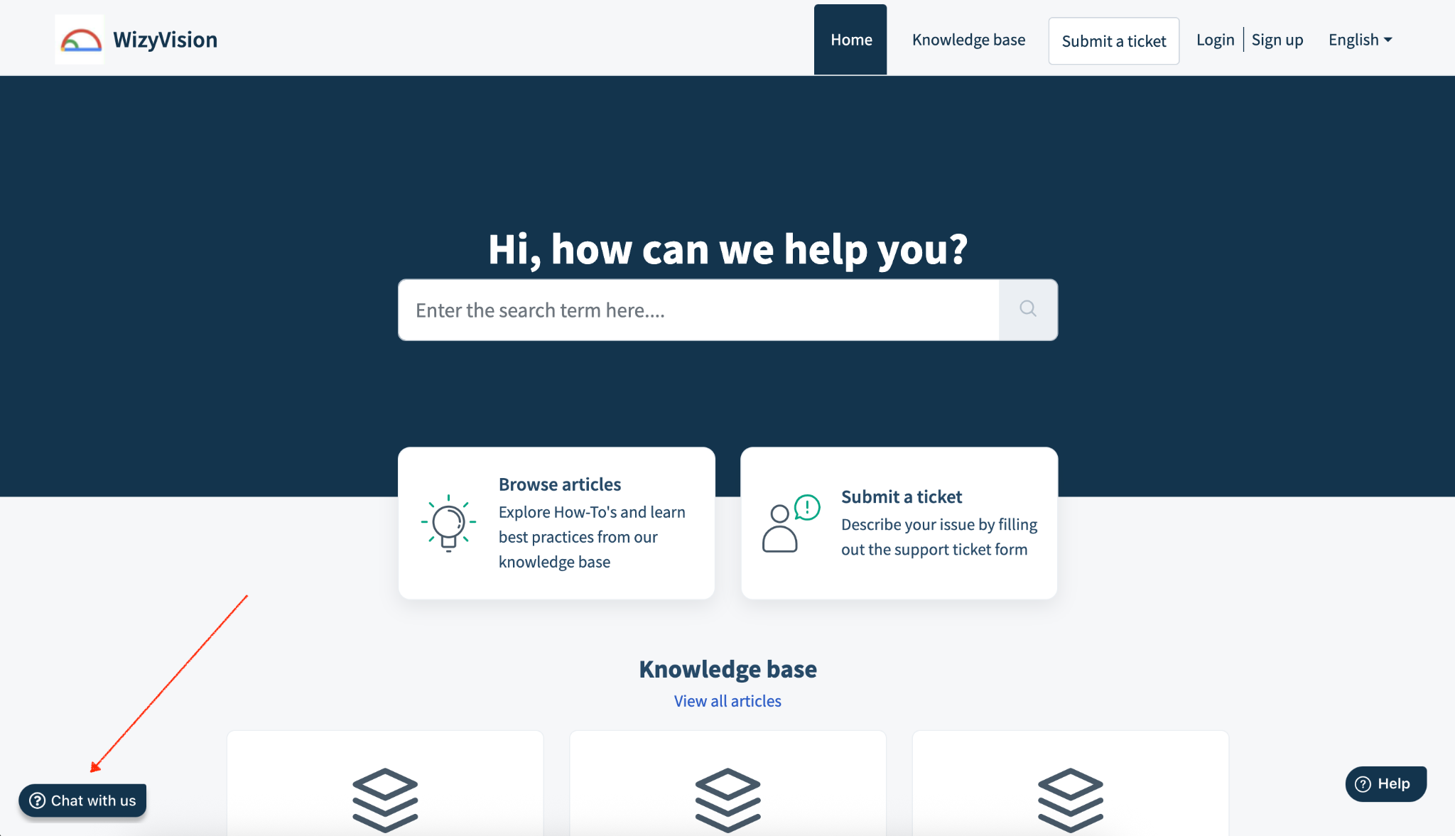 Sur le Portail d'assistance WizyVision (WizyVision Support Portal), cliquez sur « Besoin d'aide ? » (“Need help?”) dans le coin inférieur droit.