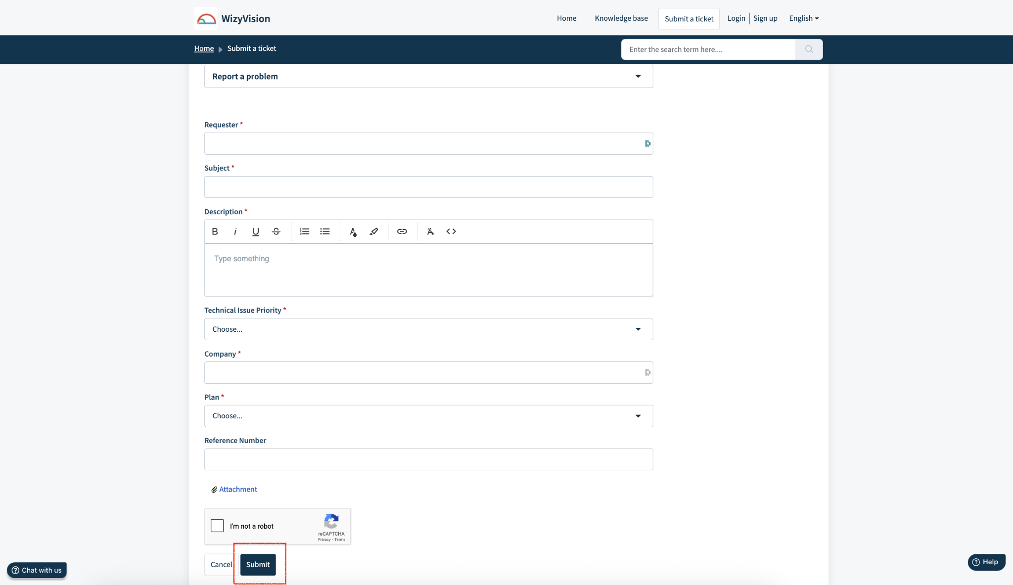 - Remplissez le formulaire de manière similaire aux champs de soumission de ticket décrits ci-dessus, y compris :